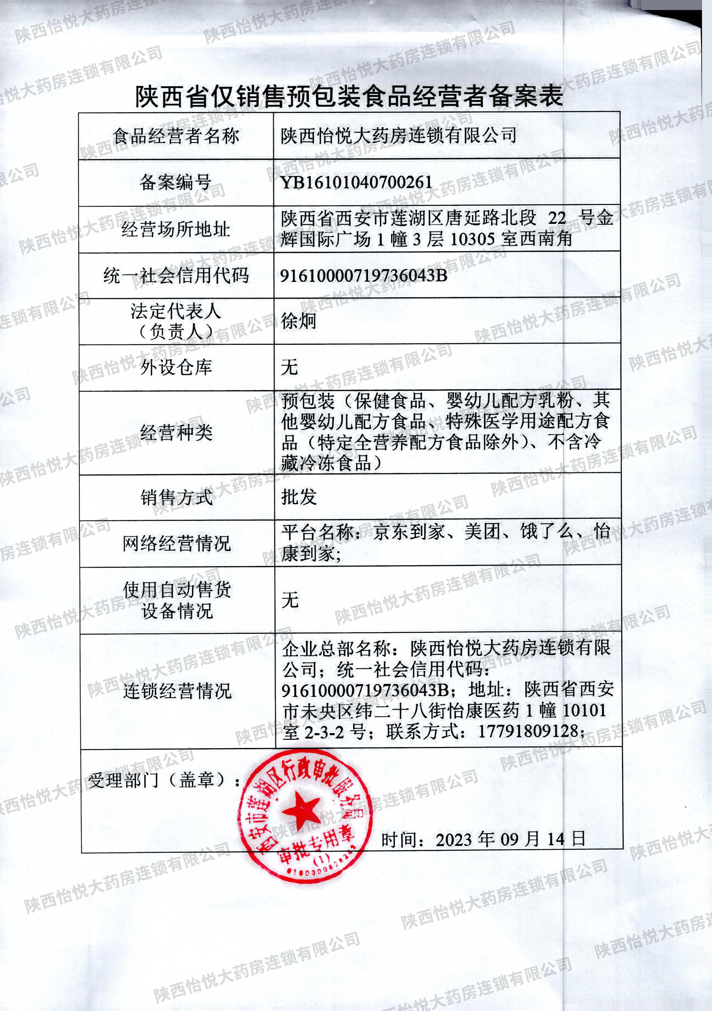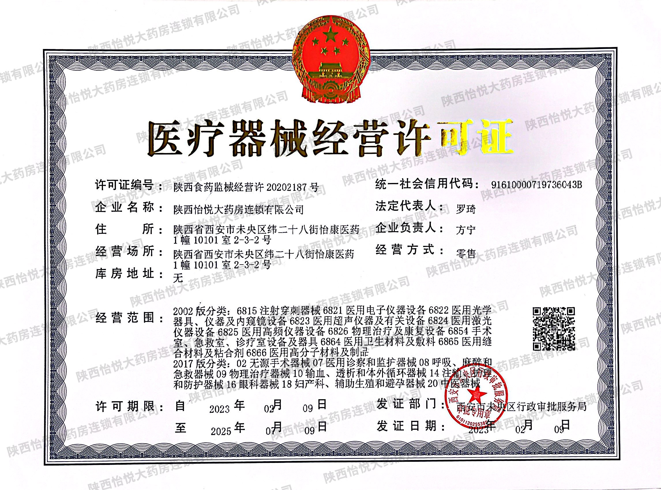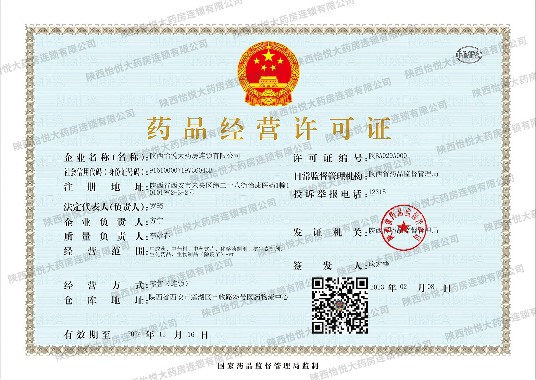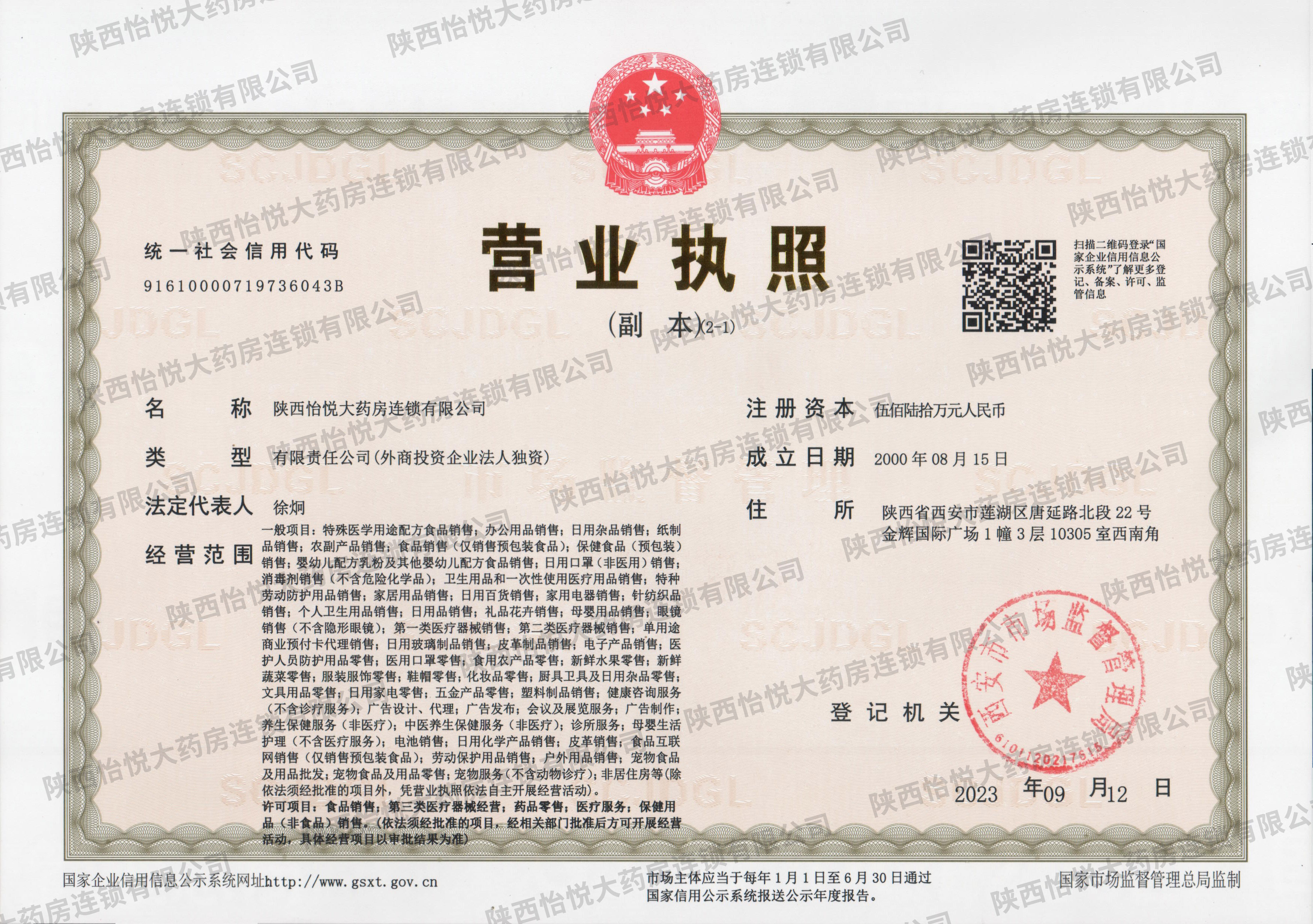 陕西怡悦大药房连锁有限公司于2000年08月15日成立。法定代表人徐炯,公司经营范围包括:化学药制剂、中成药、生化药品、抗生素、中药材、中药饮片、生物制品(除疫苗)、医疗器械的零售;预包装食品、散装食品、婴幼儿配方乳粉、其他婴幼儿配方食品、保健食品、特殊医学用途配方食品的销售;宽带费、电话费、水电费代缴;城市一卡通IC卡的发售、充值代缴;商业预付卡的代理及发售;计算机软硬件、孕妇婴幼儿用品、照相器材、电讯器材、照明器材、儿童玩具、服装鞋帽、消毒用品、计生用品、洗涤用品、保健用品、卫生材料、日化产品、玻璃仪器、日用百货、家用电器、五金交电、皮革、塑料制品、农副产品、电子产品、健身器械、办公文化用品、化妆品、眼镜、化学试剂(不含易燃易爆危险品)的销售;医药信息咨询服务;健康管理咨询服务(医疗诊断除外);保健按摩服务;足疗服务;展览展示服务;场地租赁;中医科;推拿按摩;艾灸;广告的设计、制作、代理、发布等。